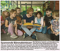 Marler ZeitungSpannende Bärenabenteuer: Die Hertener Autorin und Künstlerin Eva Ernst las in der Kinderbücherei Türmchen aus ihrem Buch „Tami findet neue Freunde“ vor, das sie selbst illustriert hat. Die Geschichte erzählt von einer Bärenpuppe, die ihre Abenteuer im Schlosspark Herten erlebt. Viktoria, Aira, Conner, Helin, Kilian und Lilou hörten gespannt zu. Im Anschluss bastelte Eva Ernst gemeinsam mit den Kindern Lesezeichen. |